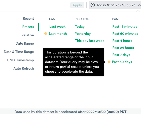 When you select a time range with the Select Time Range option, some options may have a yellow diamond icon data acceleration next to them. These are time ranges extending past the Datasets’ acceleration window in your query. These Datasets may be partially or completely unaccelerated.