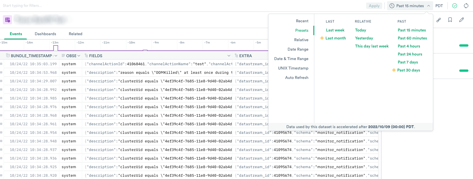 Observe also automatically extends this acceleration window forward as new data arrives, so queries on any time range after creating a Dataset also perform quickly and efficiently.