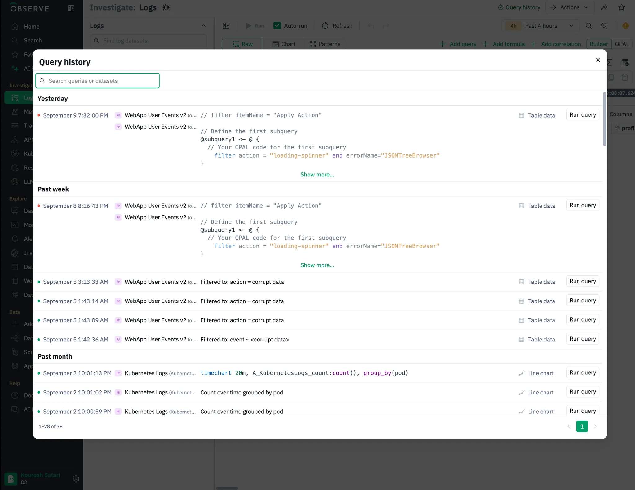 - Click Run query to will apply that query to the Explorer, carrying over visualization settings, time range, and expression builder / OPAL state.