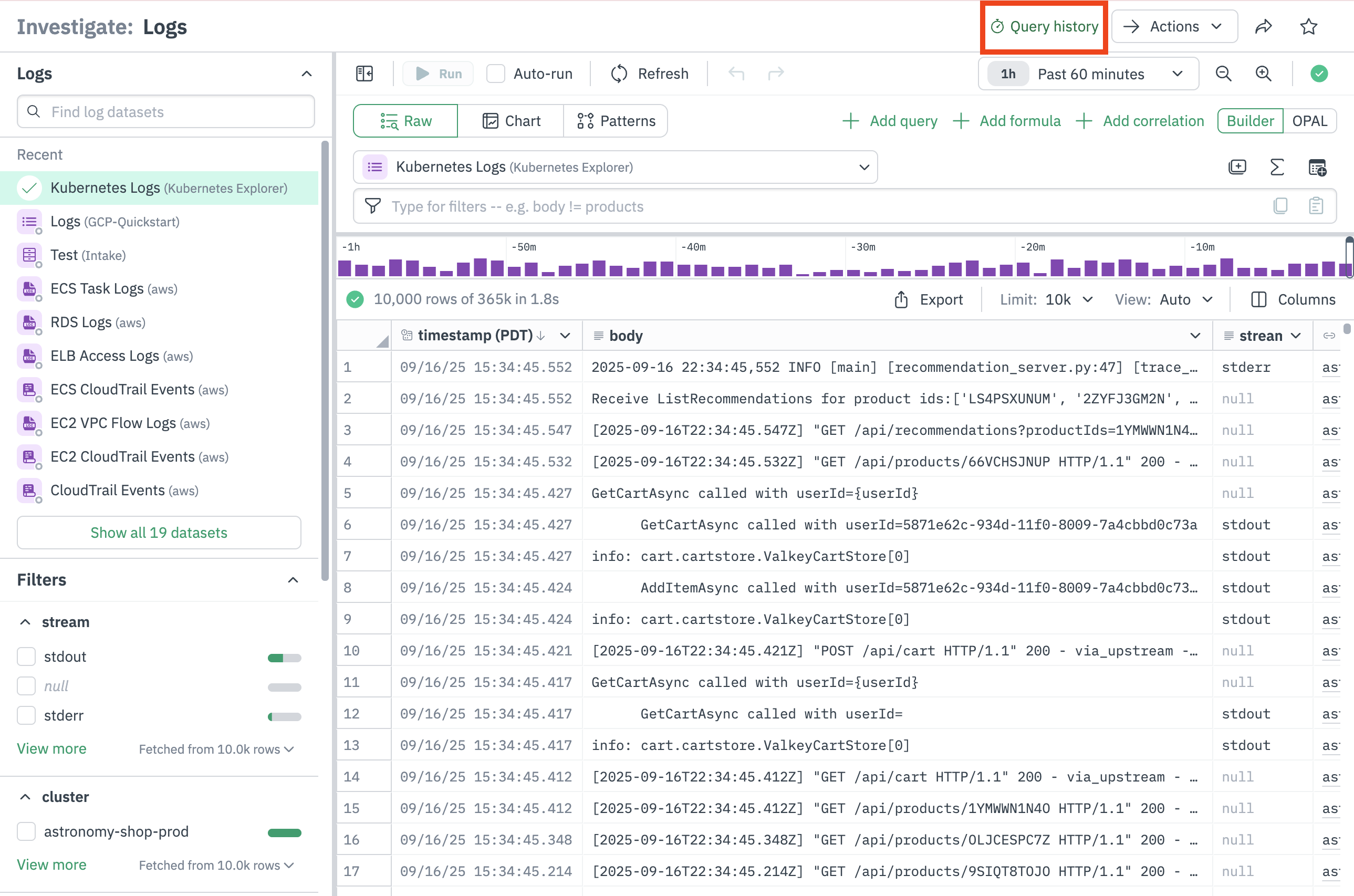 To access the query history from an Explorer, click Query history in the Explorer's header. For example, from the Log Explorer:
