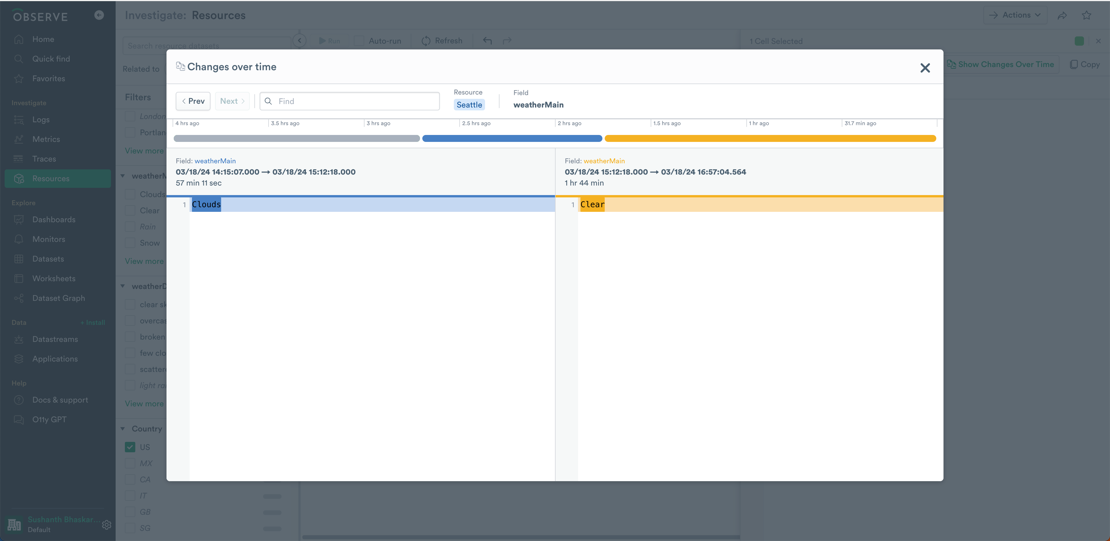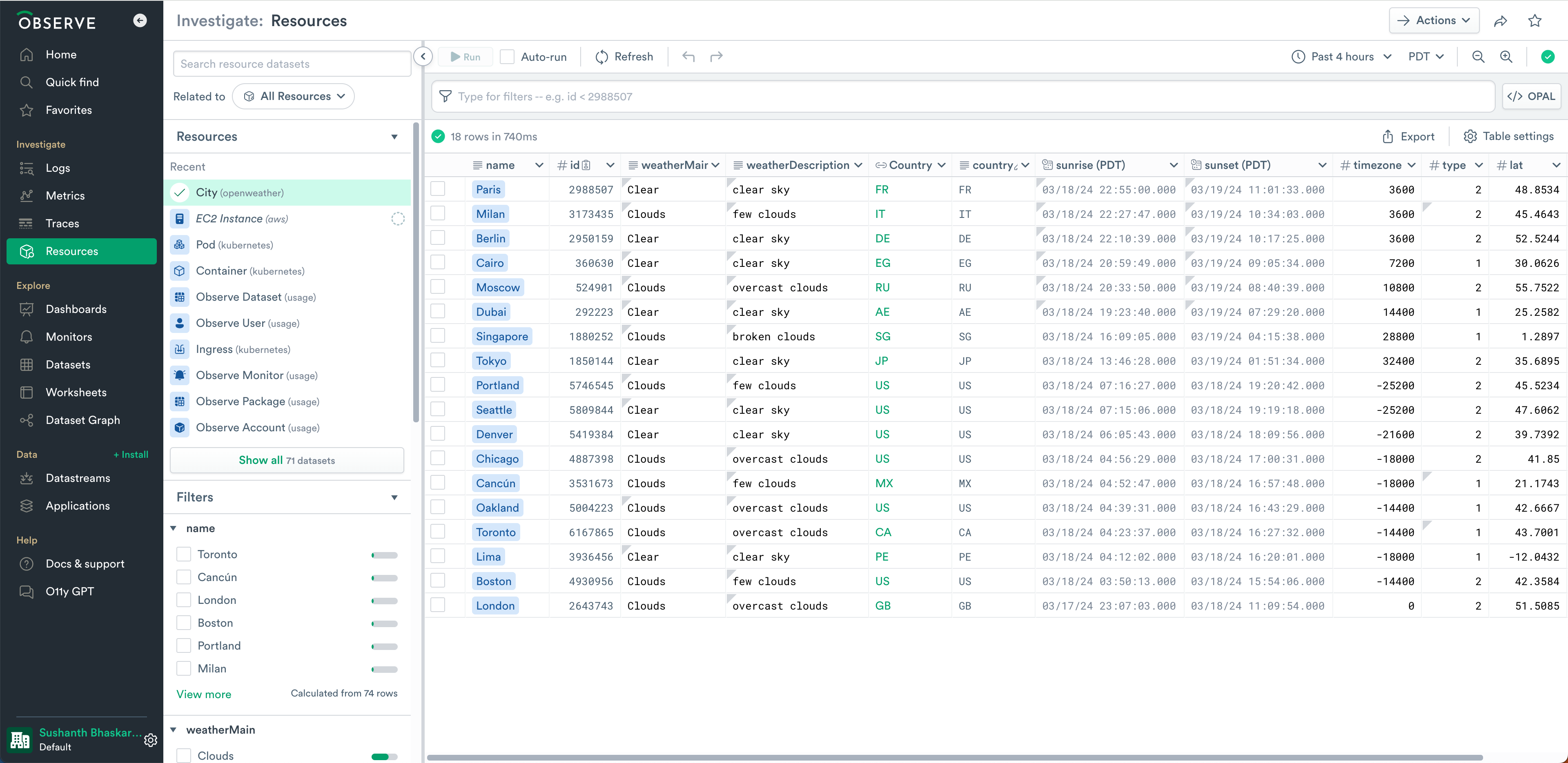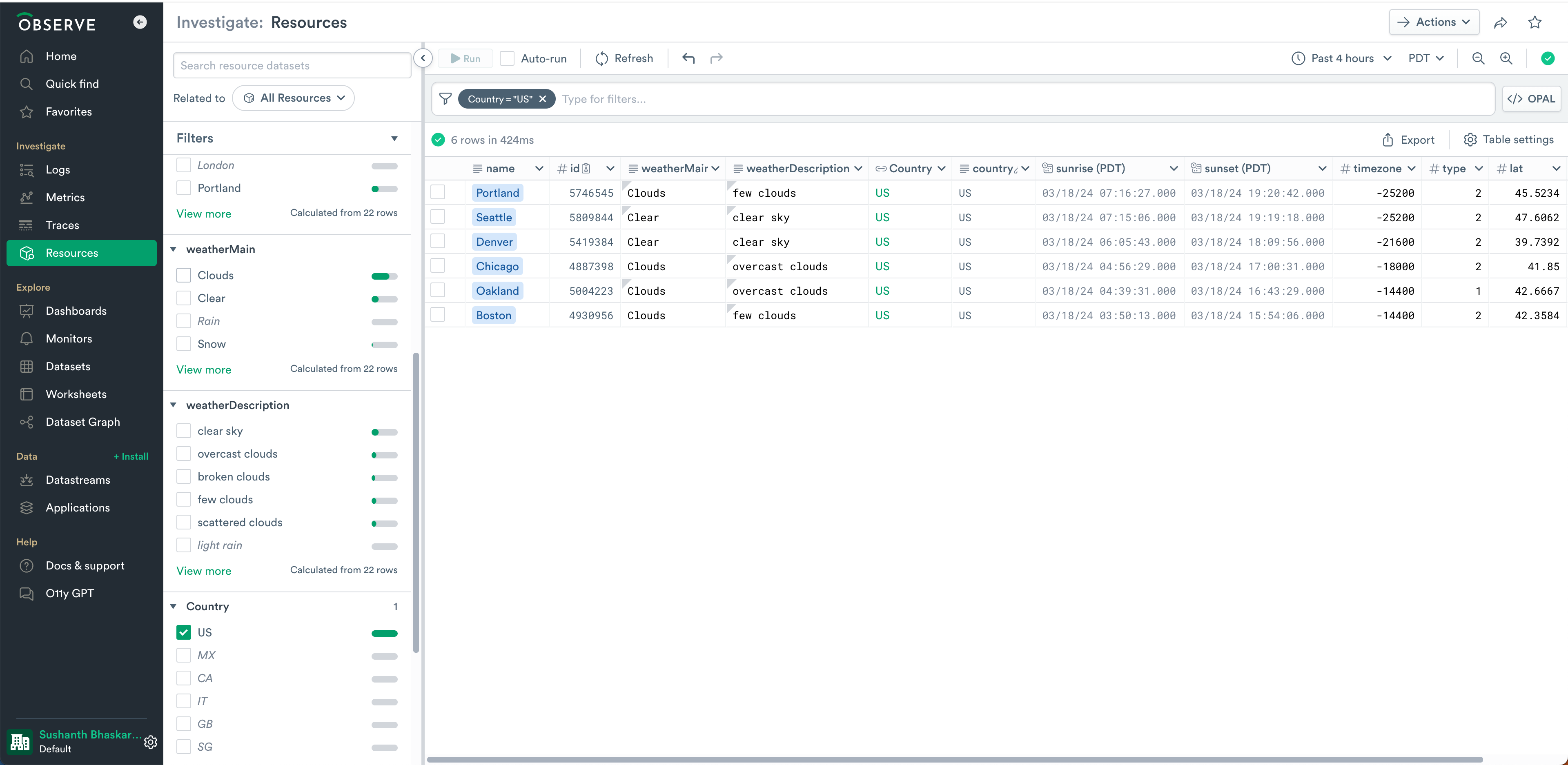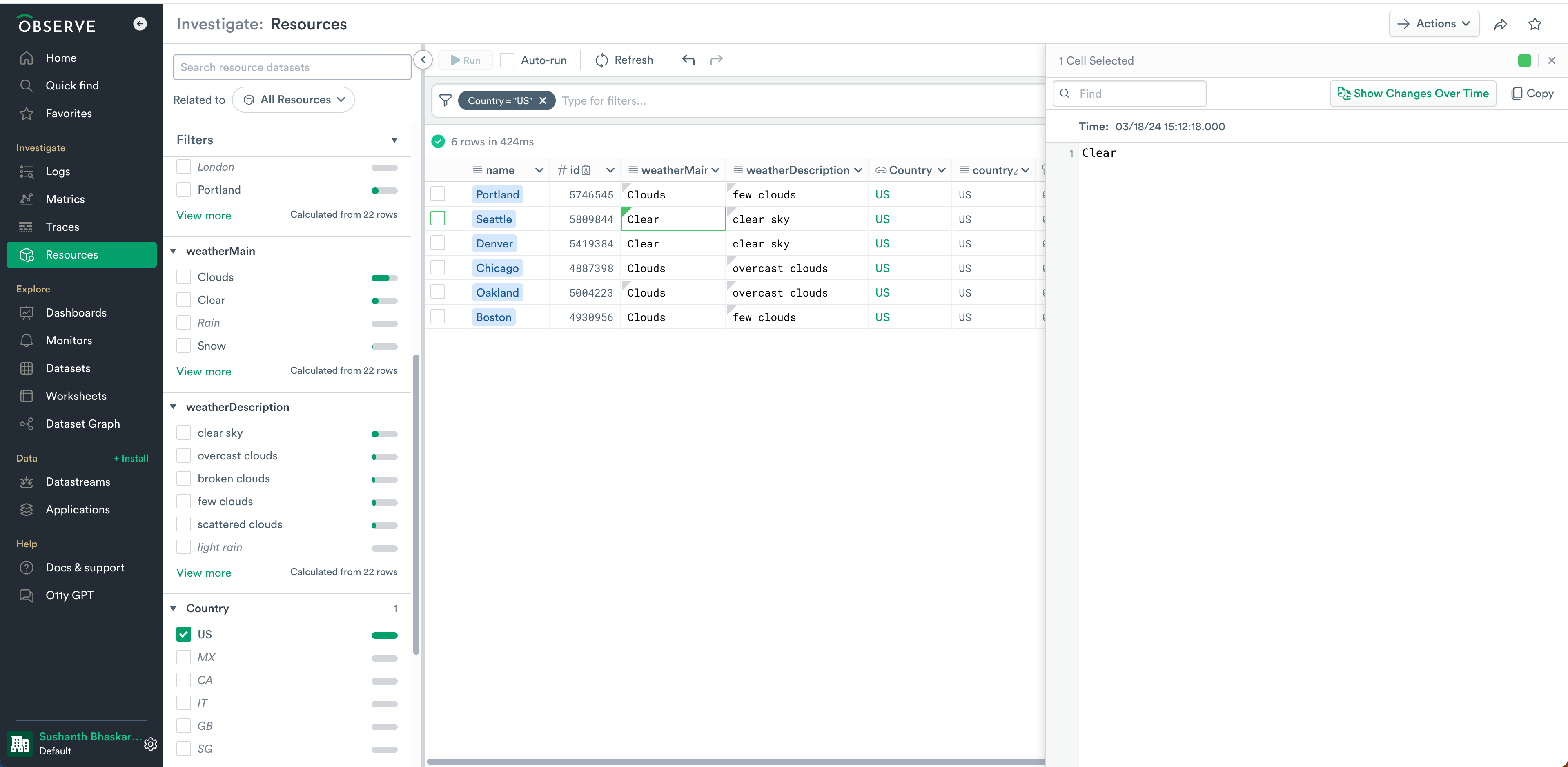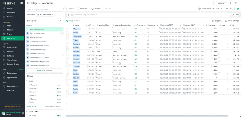 Each row in the main table now represents a US city. As Observe receives new data about these cities -- for example, a new weather data point -- the resource will be updated with the new data.