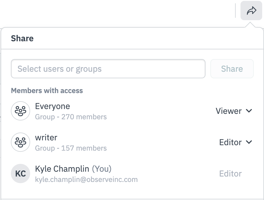 Permissions to view or edit a specific instance of an object, such as a particular monitor, dashboard, dataset, etc. can be granted at the user or group level. There are two object-level level permissions; view and edit, you can also remove groups or users from being able to access the object at all. You can access these controls via the “share” arrow in the top right of the specific object’s page.