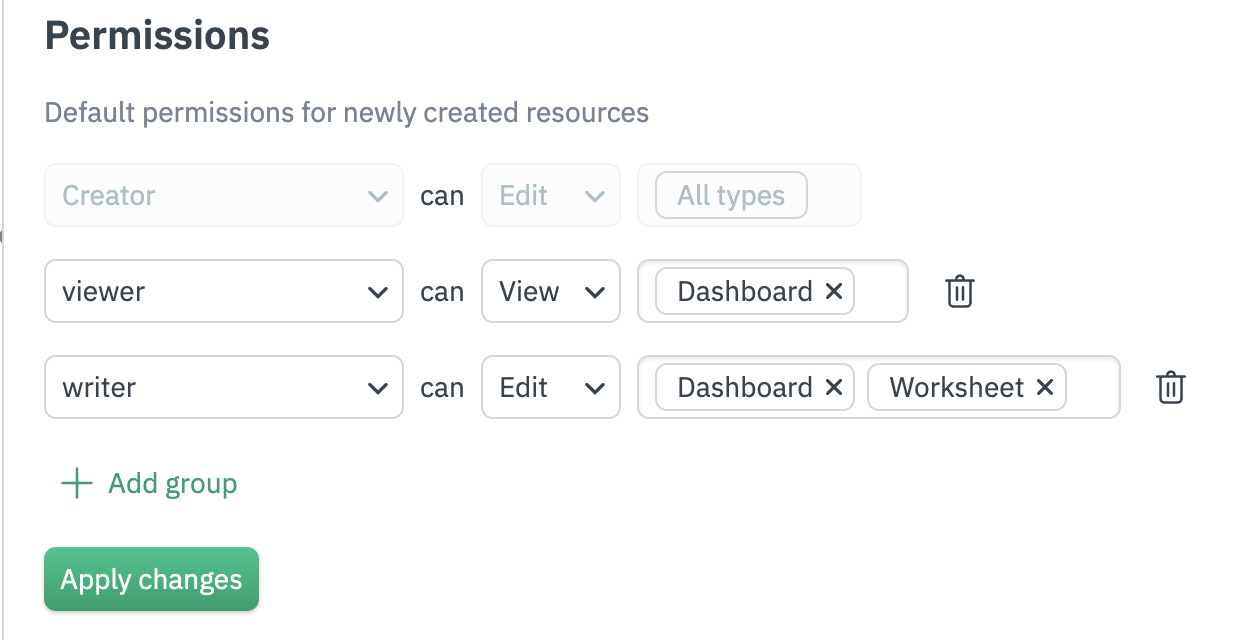 In the following example, the creator of the object can edit anything they have created, all users in the viewer group can view all newly created dashboards by default, but nothing else. All users in the writer group can edit all newly created dashboards and worksheets, but nothing else.