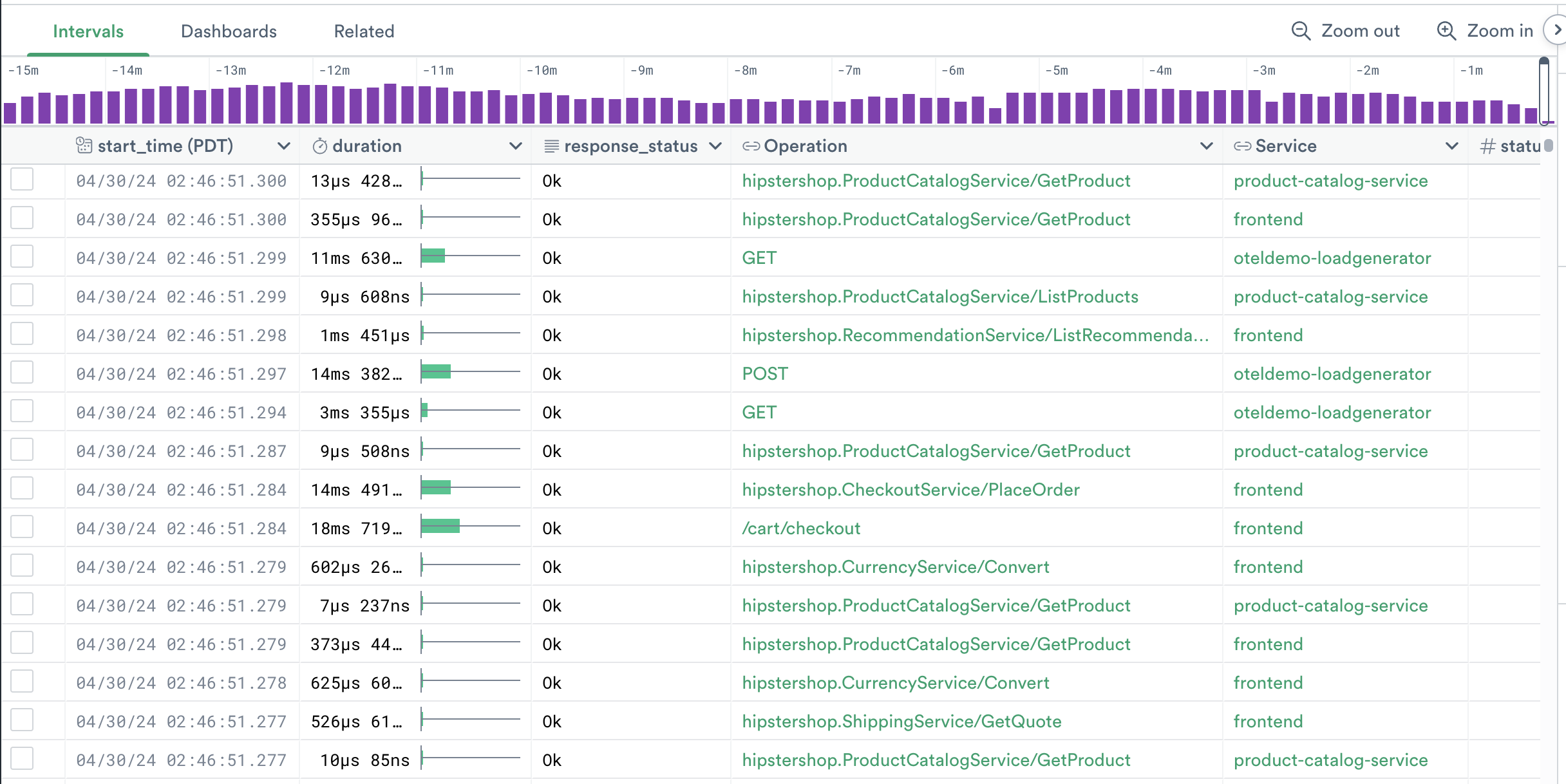 filter service_name = "frontent" and label(^Operation) = "hipstershop.CheckoutService/PlaceOrder"