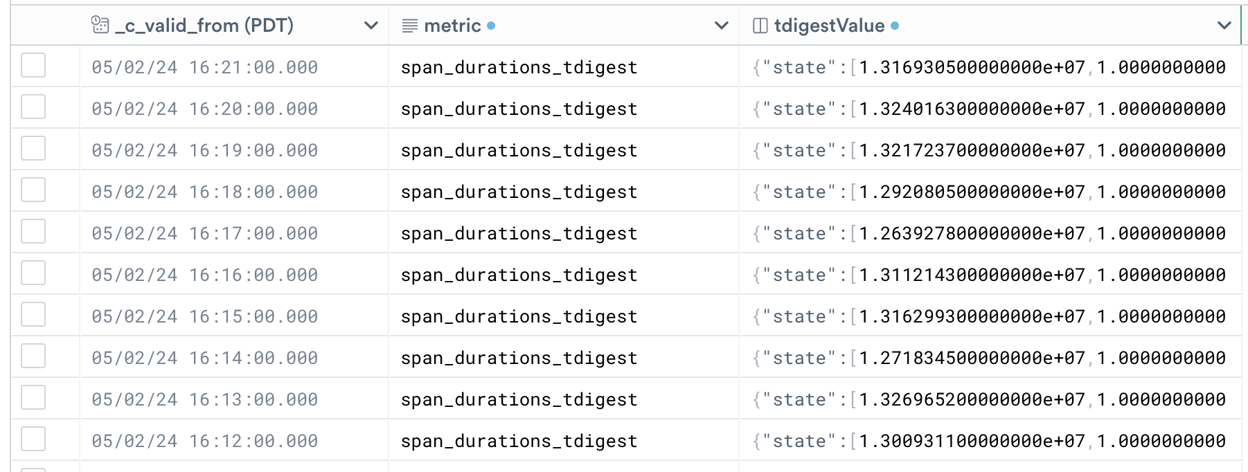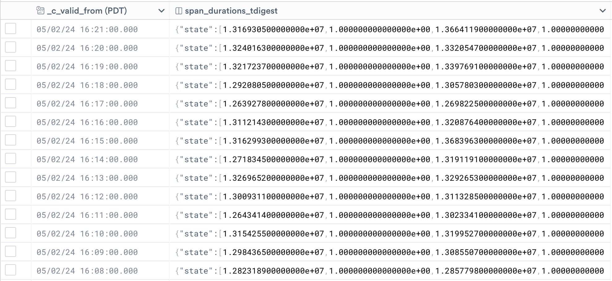 Our dataset now contains time buckets of 1s each, with a tdigest state summarizing all durations of the selected span that happened within the time bucket.
