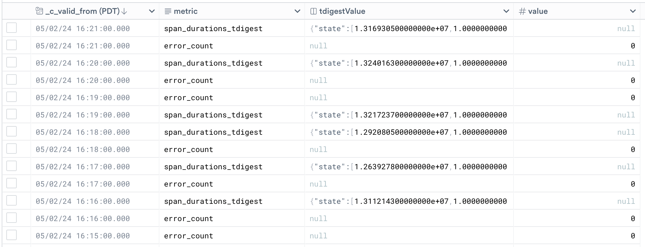 This will create a "value" column, which is populated with the (float64) value contained in the "value_variant" column only when the metric is a float64 metric. Otherwise it will contain null. The same applies for the "tdigestValue" column, which will contain the (tdigest) value contained in the "value_variant" column only when the metric is "span_durations_tdigest" (which we know is of type tdigest), otherwise null.