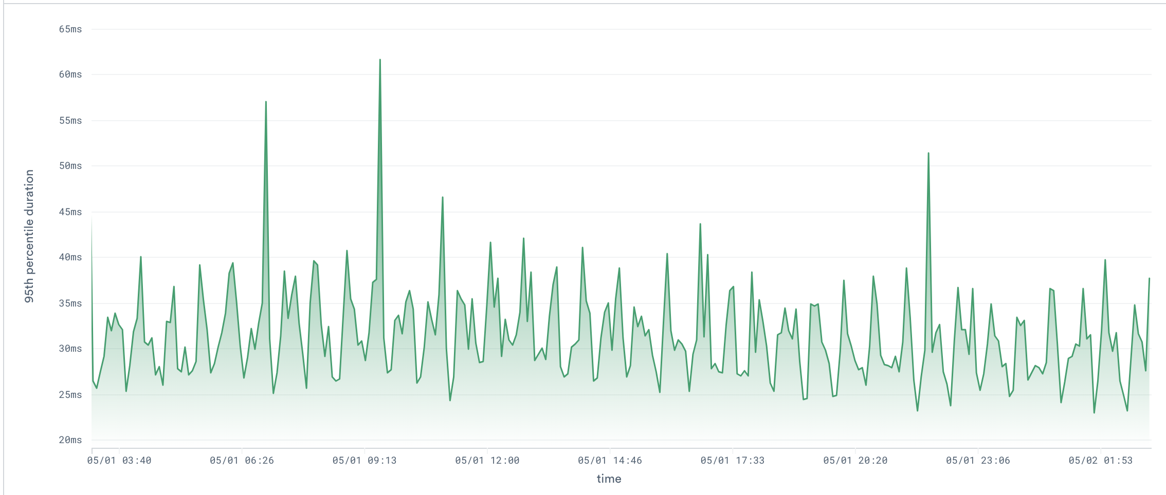 Suppose you have a Dataset containing all spans of your amazing online shop, and you want to visualize the 95th percentile duration of an operation called "PlaceOrder", which will help you figure out when placing orders has been slower than usual, and recognize trends/patterns or simply investigate an issue that happened in the system. You would like to see something like this: