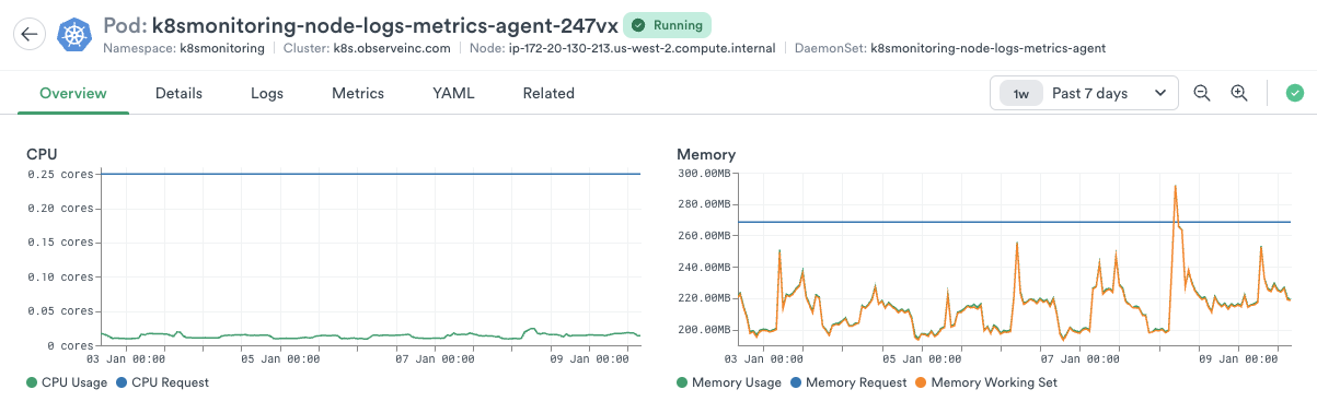 By default, the services instantiated by the Observe Agent Helm Chart are provisioned to fit expected workflows: up to 300m of CPU and 512Mi of memory for some pods but less for others (see the default values below). These are the minimum default values that we recommend. Since estimating resource consumption is difficult and varies widely based on the properties of your Kubernetes cluster and applications instrumented, it's recommended to instead first install the Helm chart and then examine the current resource consumption and tune based on that. To find your current usage, you can utilize the K8s Explorer. To do so, navigate to the corresponding Workload page for each of the deployments and daemonsets created by the Observe Agent Helm Chart. Specifically, the services to look at are: