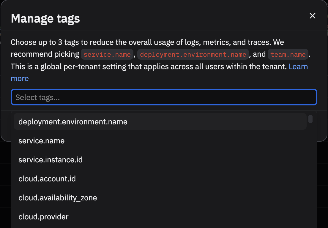 For example, if you selected service.name above, we would track usage by service. Data containing fields like FIELDS."service.name" or FIELDS."resource"."attributes"."service.name" would be included, as we search nested fields up to a certain depth. Any data without that attribute will be given the empty tag, -.