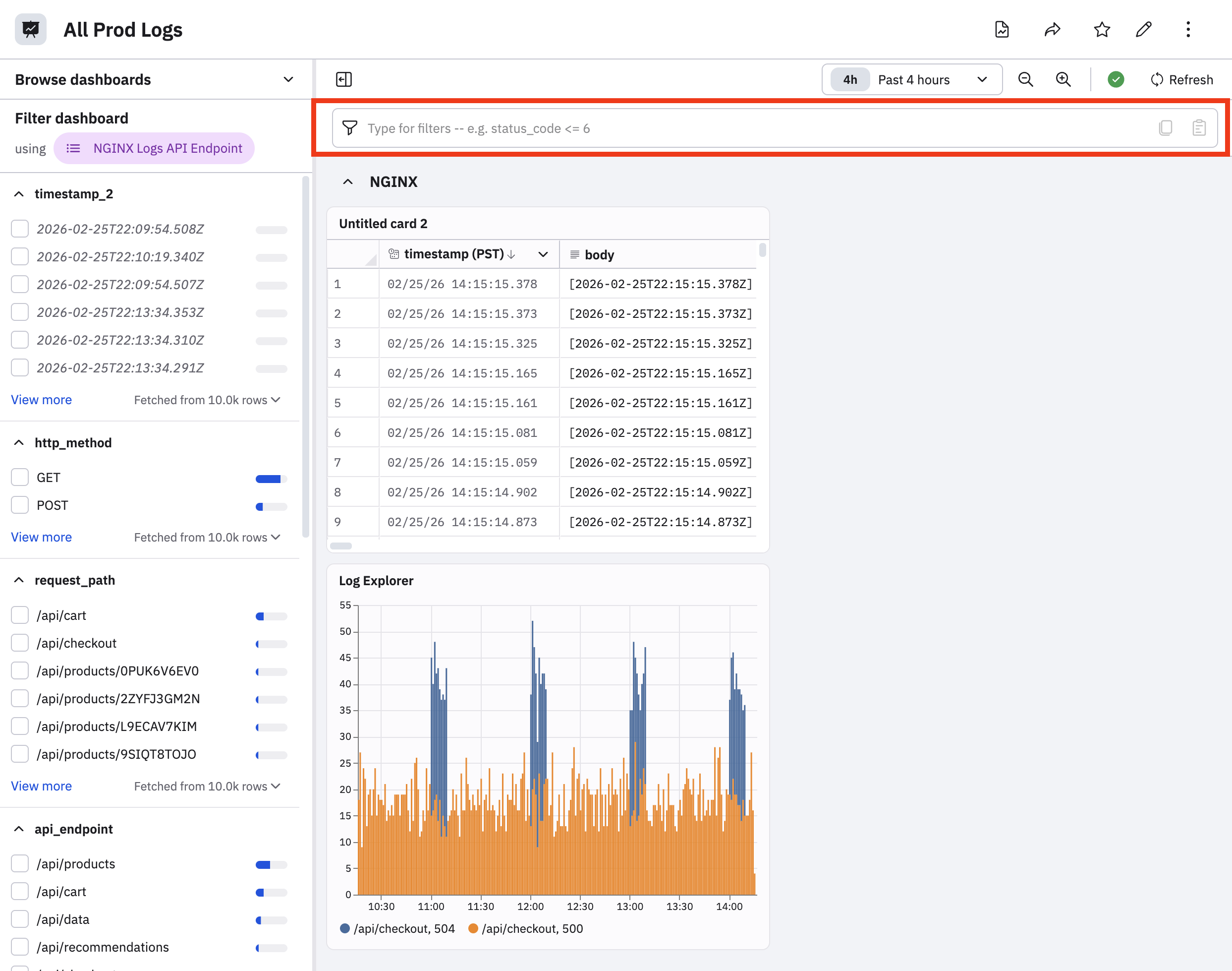 Use the filter bar to apply operations based on the Dataset used in the filter panel. You can use ~ or !~ for keyword matching. For example, on our Container Logs dashboard the filter bar can be used to quickly type reason ~ create to filter by container logs with a reason code like ContainerCreating or CreateContainerConfigError.