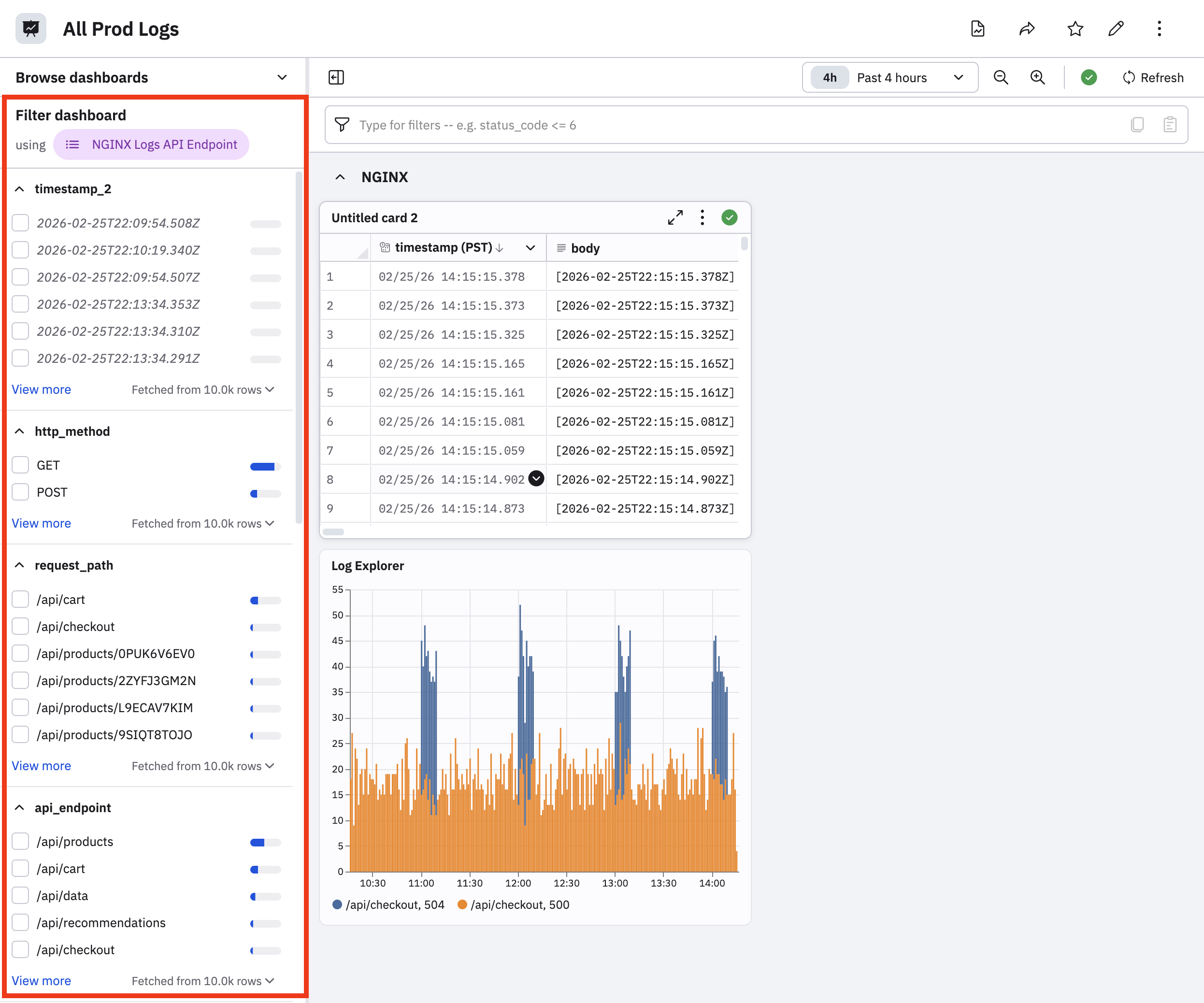 The columns of that Dataset are used to generate filters that can apply to the dashboard cards that use the filtering Dataset. For example, a dashboard displaying container logs can use a filter panel to automatically filter by container log relevant columns such as Cluster, Image, Namespace, and Reason. A card on that dashboard which does not source container logs, such as Git Commit History, will not be affected by the filter panel.