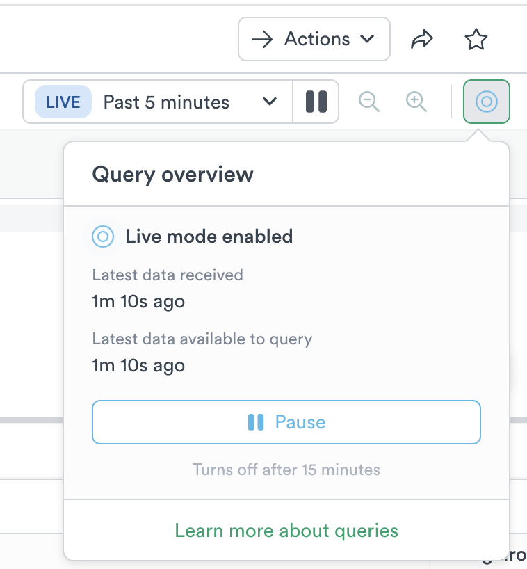 Since Live Mode increases your credit usage, you may want to disable it unless actively working on troubleshooting an ongoing issue. Live Mode automatically becomes disabled after 15 minutes. Using the Time Scrubber feature also automatically disables Live Mode.