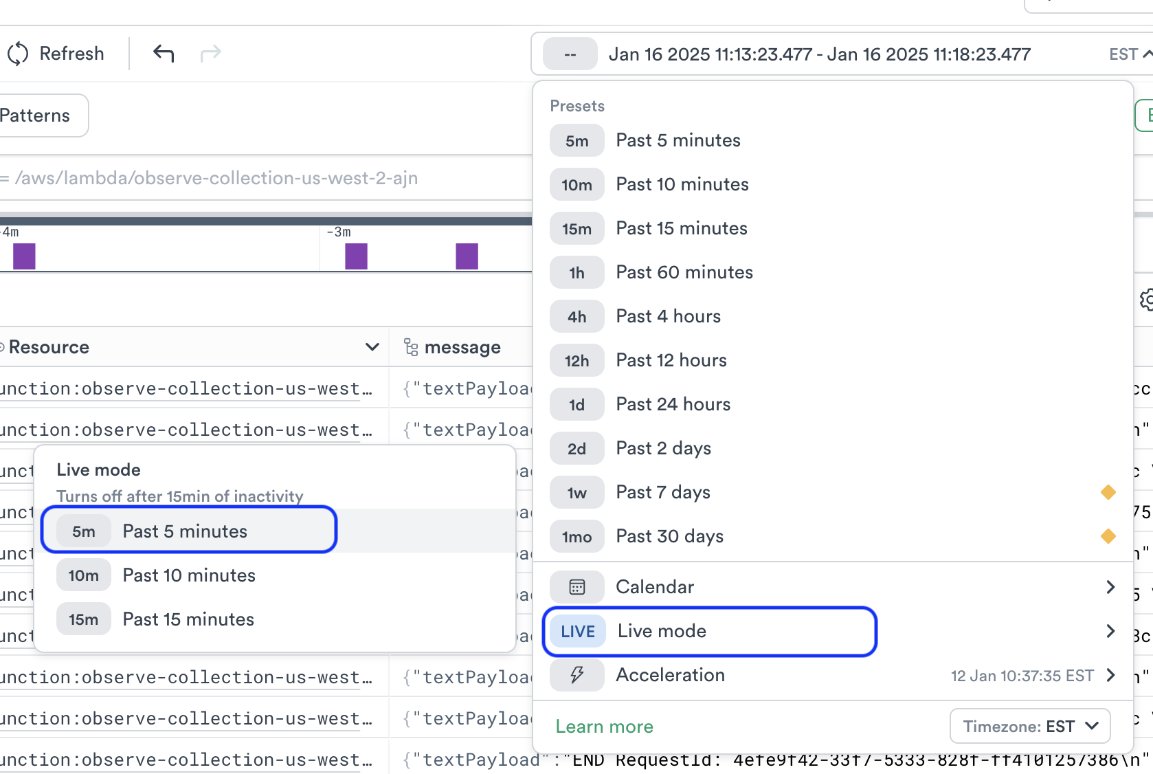 When viewing logs, you can select one of the Live Mode options from the time-range picker and see your logs stream into Observe, filter your logs and generate visualizations that continuously update with new data.