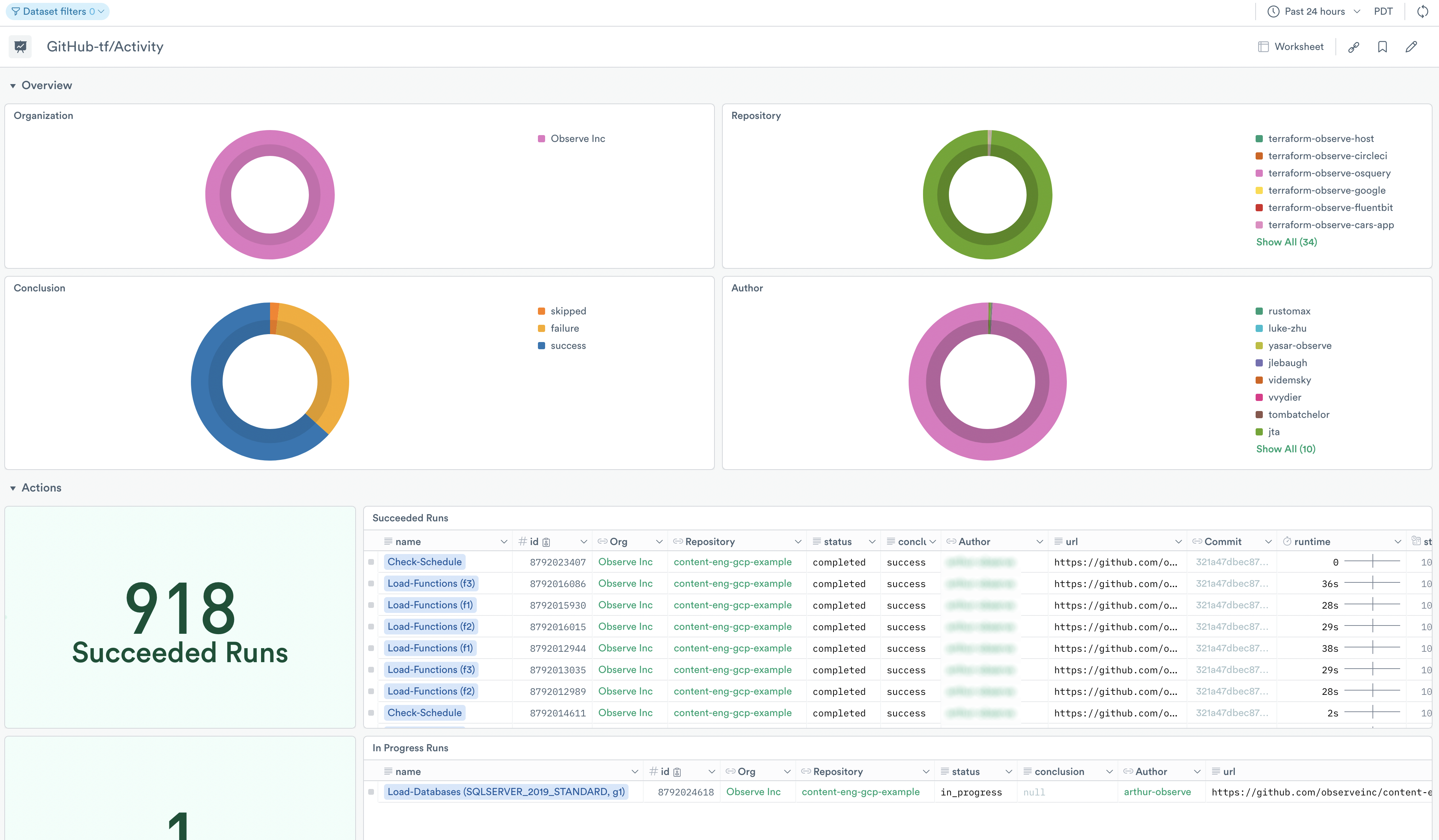 Use the dashboard for debugging and troubleshooting as well as viewing the activity in your GitHub organization within a time window. Use it to answer questions such as: