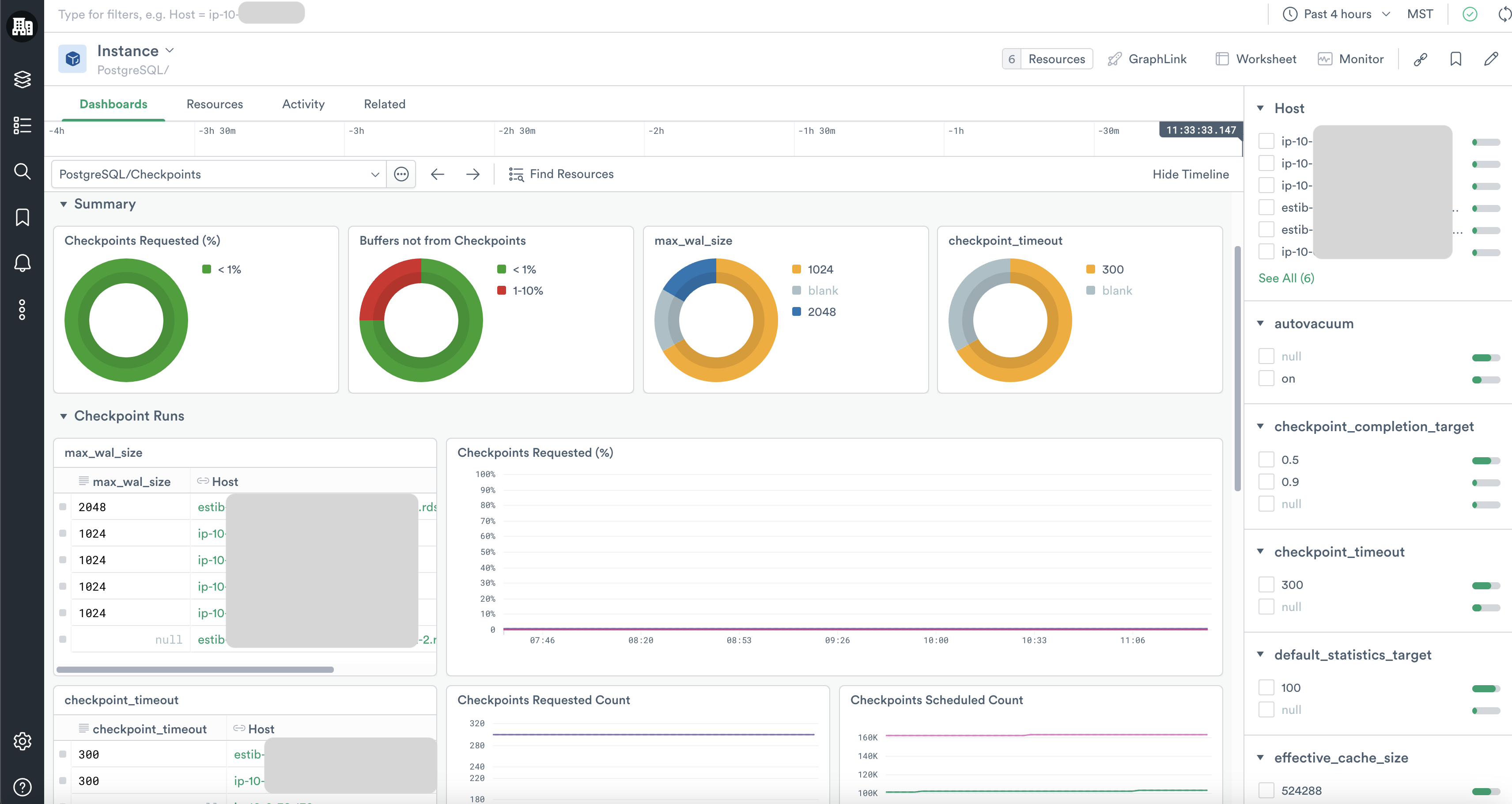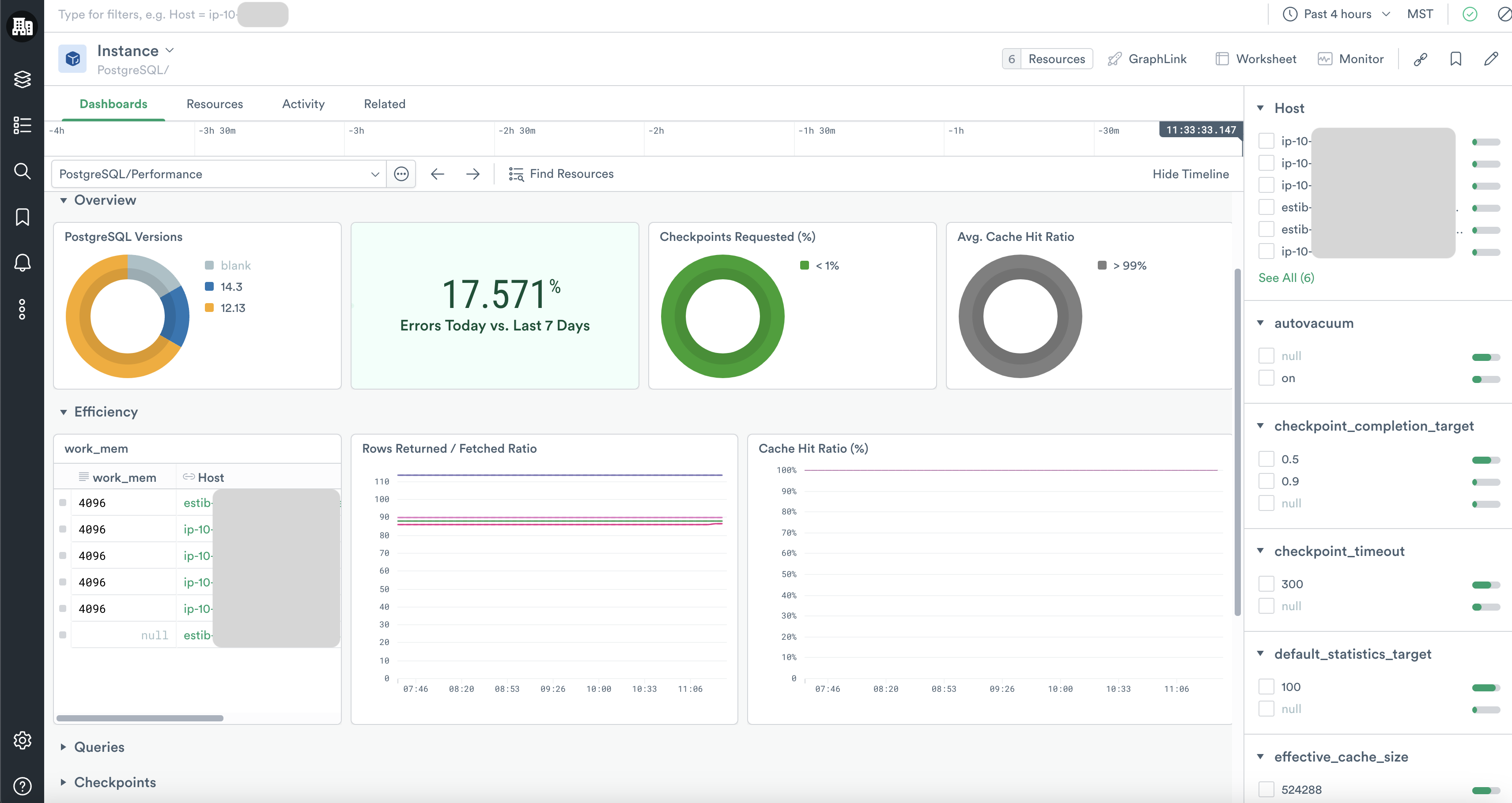 The PostgreSQL/Performance dashboard summarizes key aspects of your PostgreSQL DB instance performance, including data on cache hits, query performance, and checkpoint activity. As you identify important trends and anomalies in this dashboard, you can then pivot to other more specific dashboards and dive into deeper investigations.