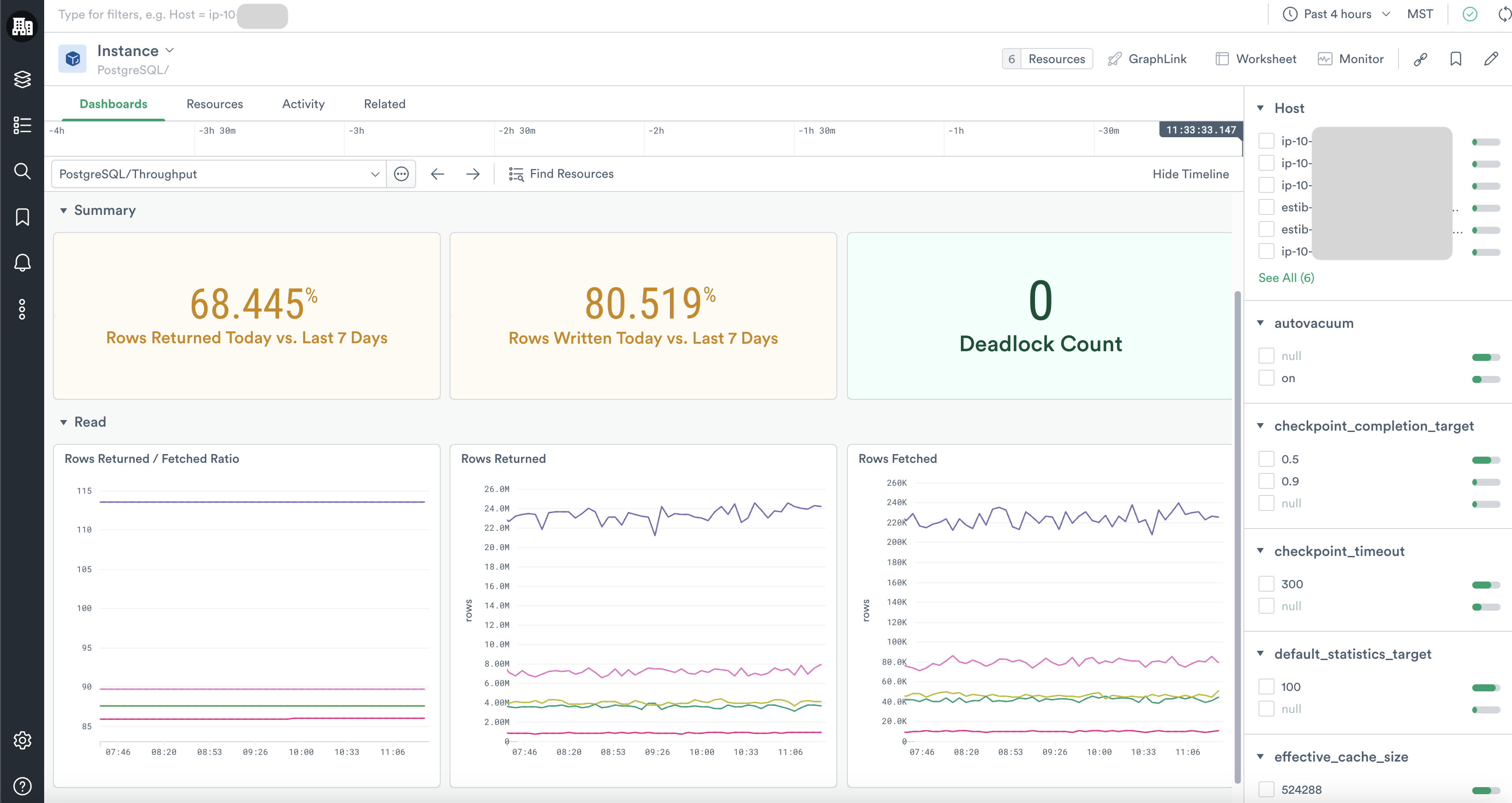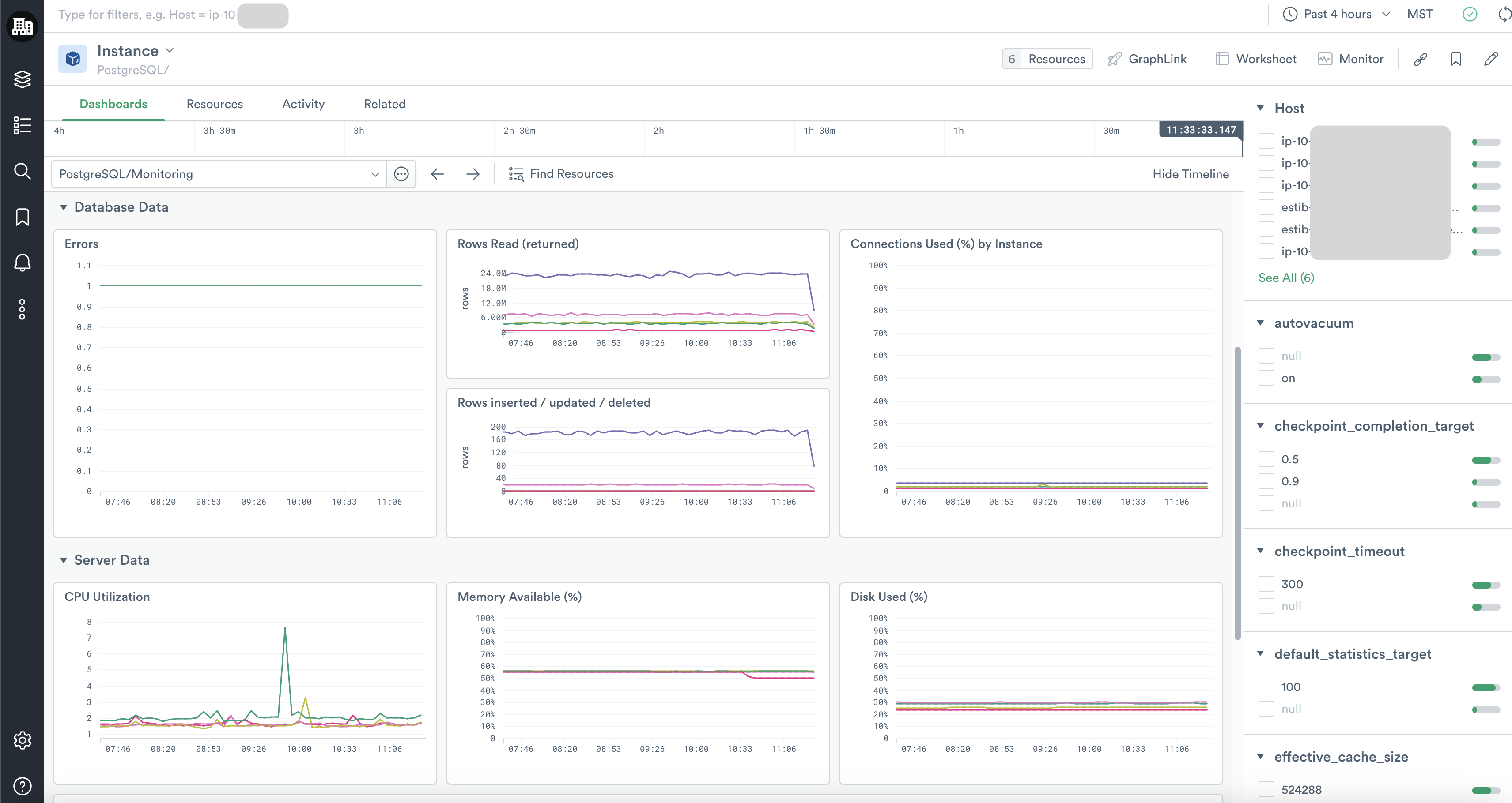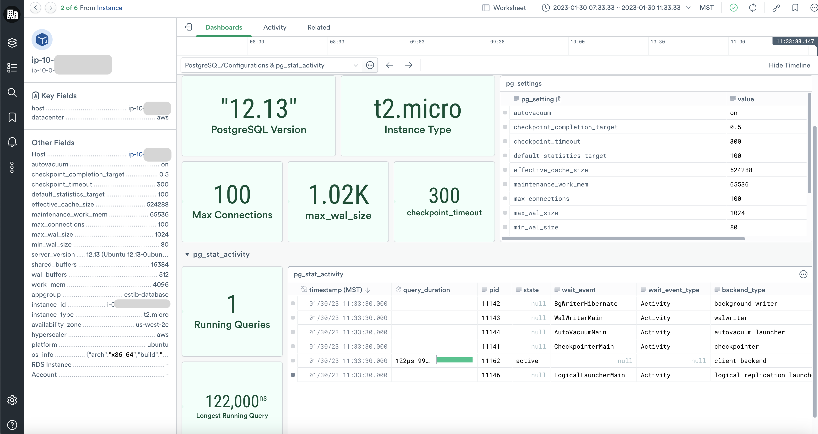 After installing the PostgreSQL app, view the health of your PostgreSQL DB instances by going to the Instance dataset in Observe. This dataset models the instances of PostgreSQL DB running in your environment, whether you manage the instance on a host or through a managed service on a cloud provider. This dataset offers GraphLinks to the following resources: