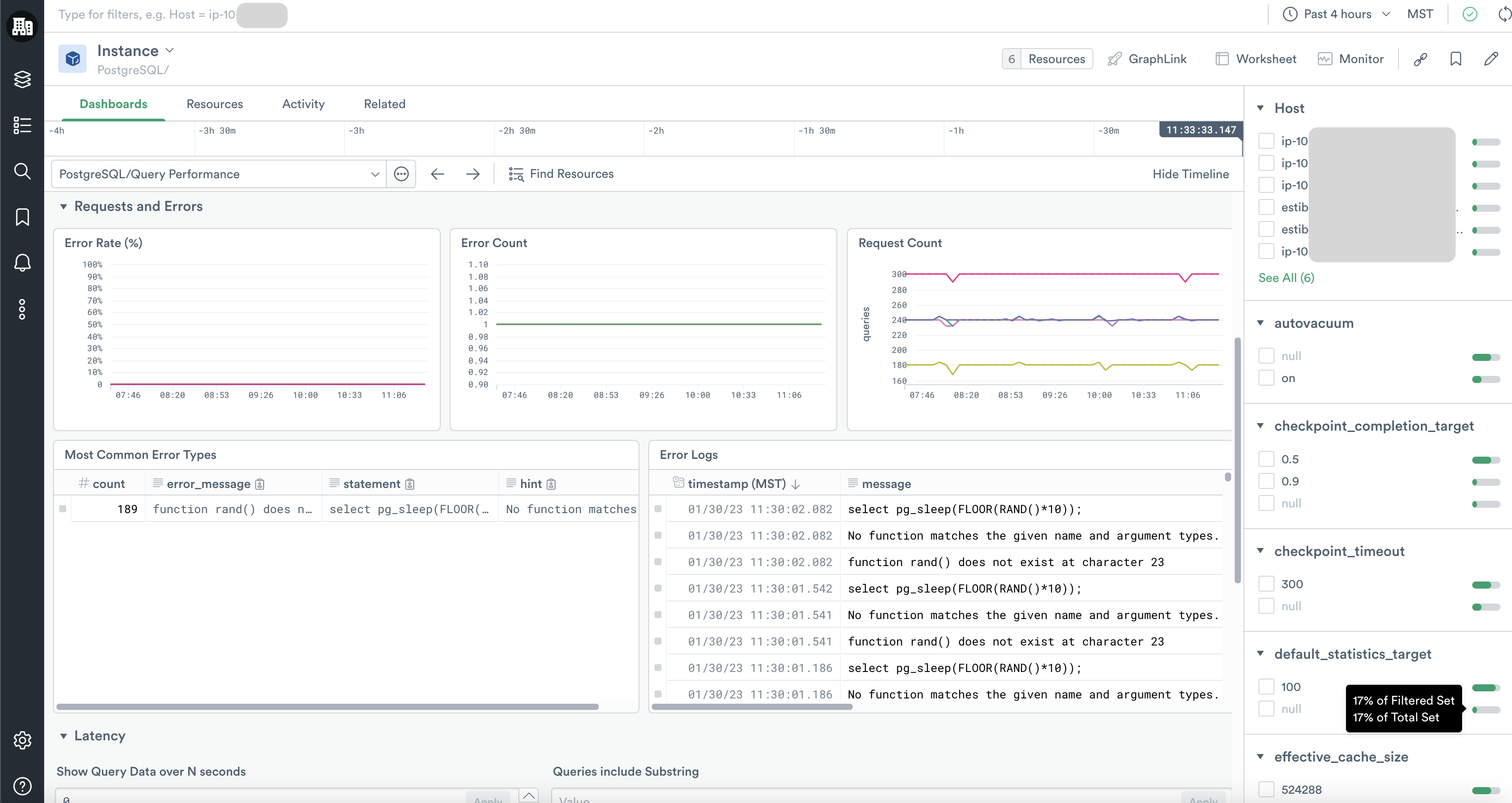 With the PostgreSQL/Query Performance dashboard you can explore the error rates, request rates, and latency of queries on your database instances. You can even inspect which queries are associated with extra latency.