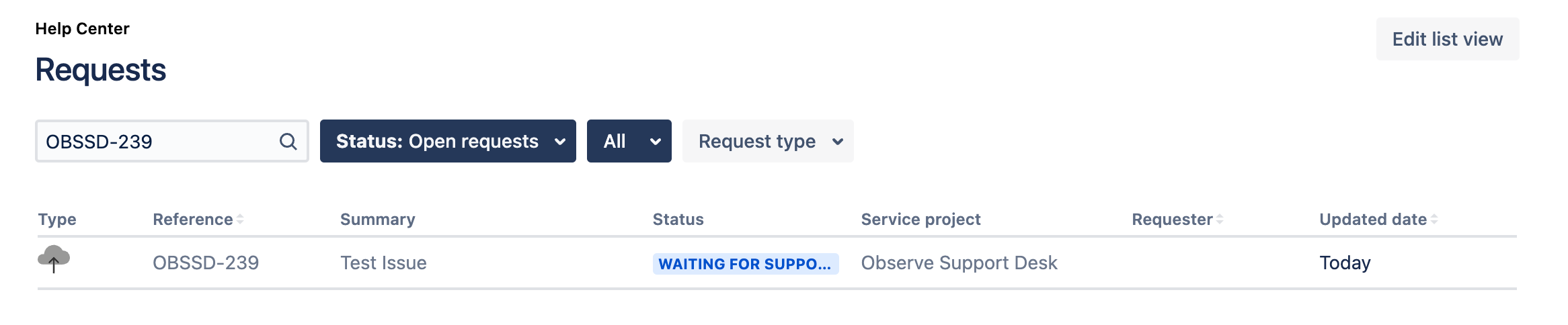 On the Requests page, you can search through any requests you have submitted to Observe Product Specialist team.