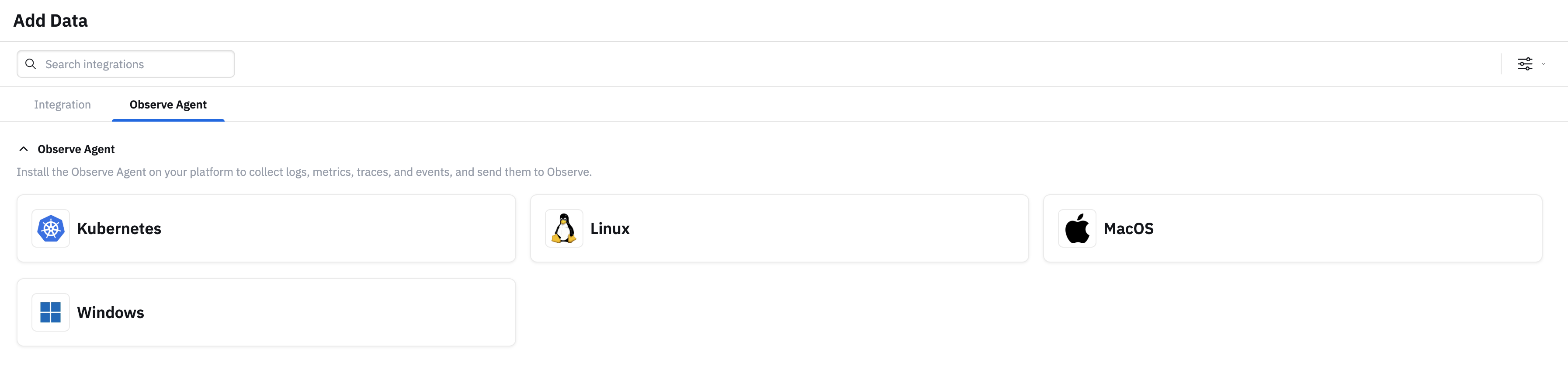Use the Add Data portal to install the Observe Agent in your environment. Pick your environment, then follow the on-screen instructions to install the Observe Agent.